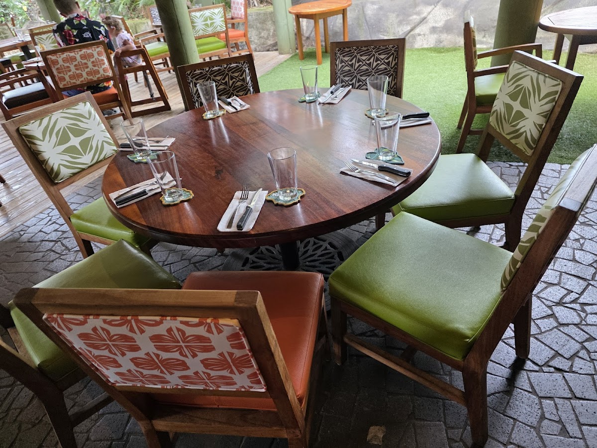 As you step into the restaurant, you'll be greeted by an inviting, laid-back vibe. The large open-air design, surrounded by lush greenery and the sounds of soft Hawaiian music, transports you right into the heart of paradise. It’s the kind of place where you can relax, soak in the beauty of your surroundings, and let the stress of everyday life melt away.